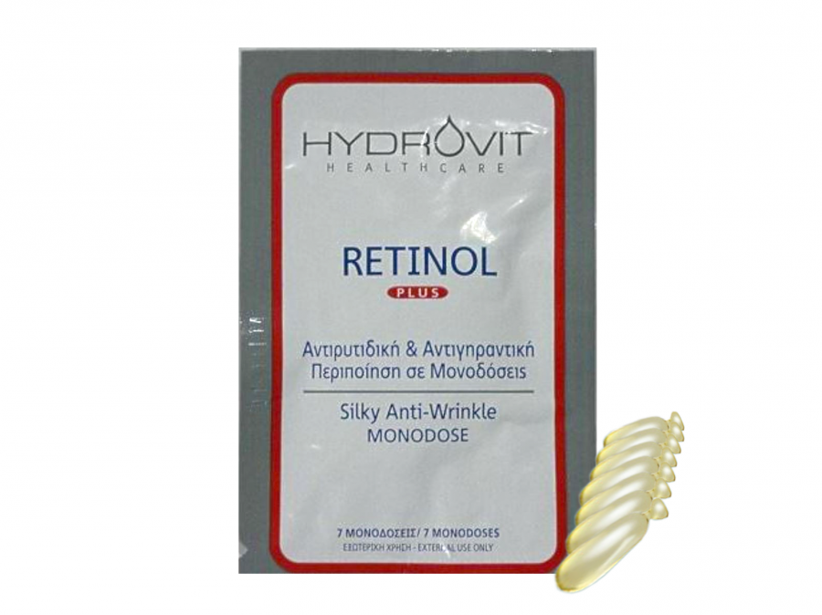 H Hydrovit Retinol Plus είναι μία νέα, ενισχυμένη σύνθεση σε μονοδόσεις, που προσφέρει υψηλής απόδοσης αντιρυτιδική περιποίηση με μοναδικό τρόπο χρήσης. Κάθε μονοδόση περιέχει το συστατικό Retinolπου μειώνει τις ρυτίδες. Περιέχει επίσης εκχύλισμα Αβοκάντο με ευεργετικά για το δέρμα συστατικά, όπως Bιταμίνες C, E και Β (Νιασίνη, Ριβοφλαβίνη, Παντοθενικό Οξύ, Φυλλικό Οξύ) με αντιοξειδωτικές και αντιγηραντικές ιδιότητες, ω-Λιπαρά οξέα που προσφέρουν ενυδάτωση και Λεκιθίνη που εμφανίζει μαλακτική δράση .